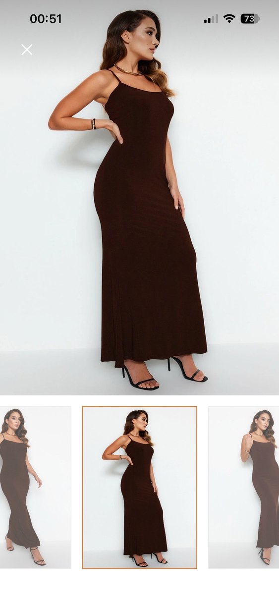 Kahverengi, uzun ve drapeli bu elbise, V yakalı ve kolsuz tasarımıyla şık bir görünüm sunar. İnce kesimi ve satenimsi dokusuyla romantik akşamlar için idealdir.