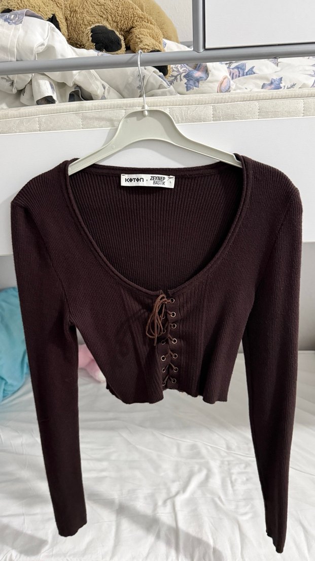 Bu kahverengi triko bluz, uzun kollu ve V yaka bağcıklı detaylara sahip, günlük kullanıma uygun gotik esintili şık bir parçadır. L beden ama ben Xs giymeme rağmen giyiyordum tüm bedenlere olur