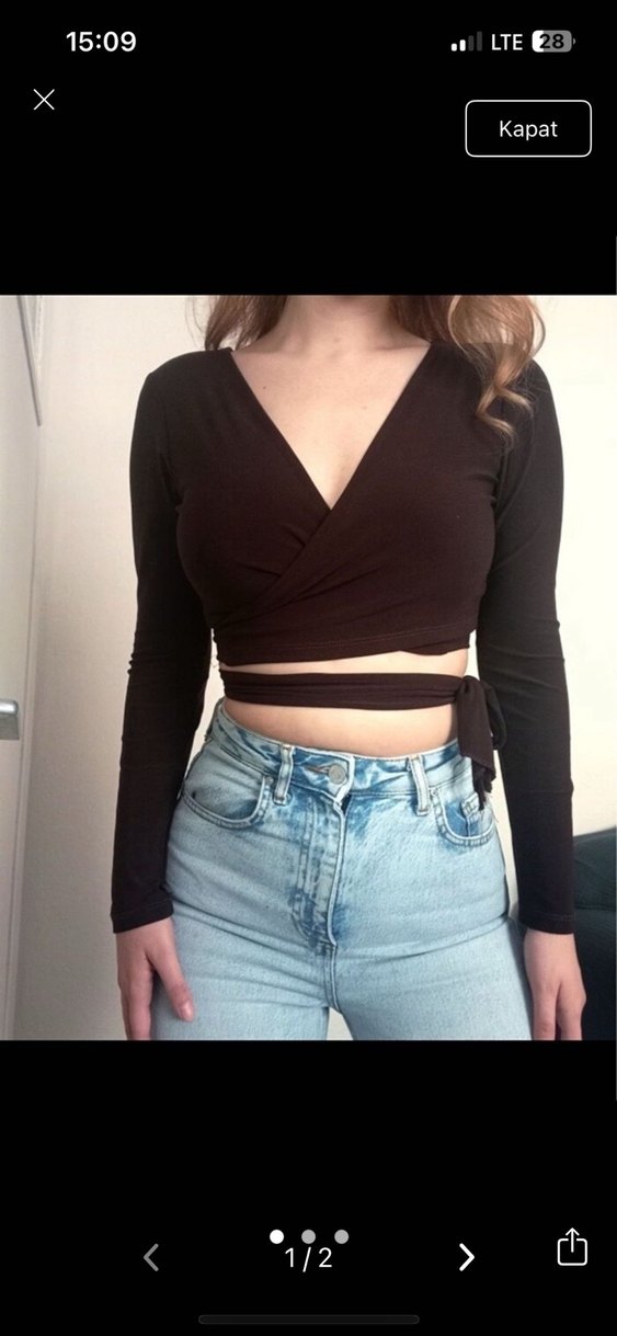 Bu kahverengi, V yakalı crop top, uzun kollu ve bağlamalı detaylı olup, günlük rahat kullanım için denim kumaştandır.