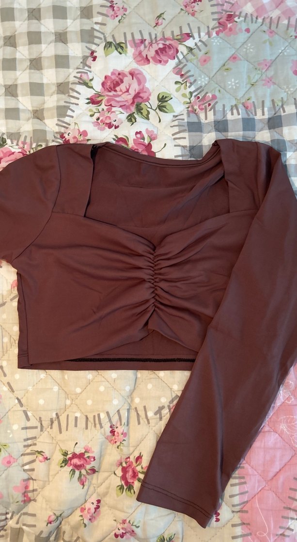 Kahverengi, V yaka, uzun kollu, drapeli detaylı, normal midi boyda, sentetik kumaştan yapılmış, dar kesim kadın bluz.
