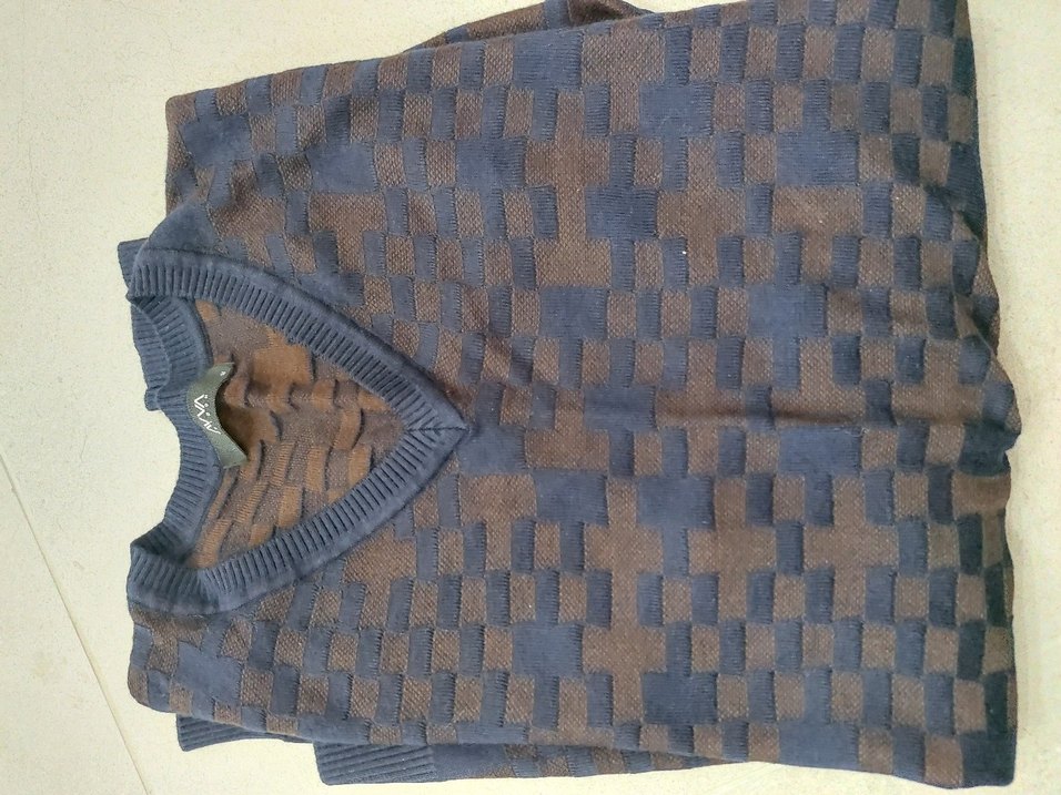 Koyu kahverengi ve mavi kare desenli, V yaka ve uzun kollu erkek triko kazak. Rahat kesim ve günlük kullanıma uygun.