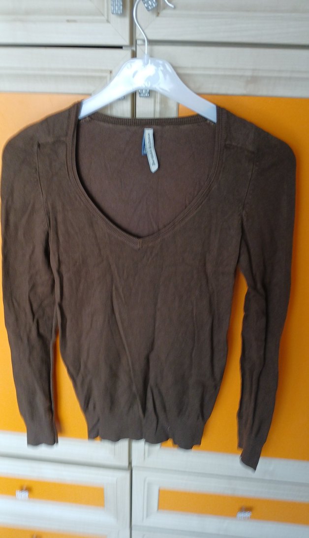 V yaka ve uzun kollu, kahverengi keten kumaştan yapılmış dar kesim kazak. Normal uzunlukta, desensiz tasarımı gündelik sokak stiline uygundur.