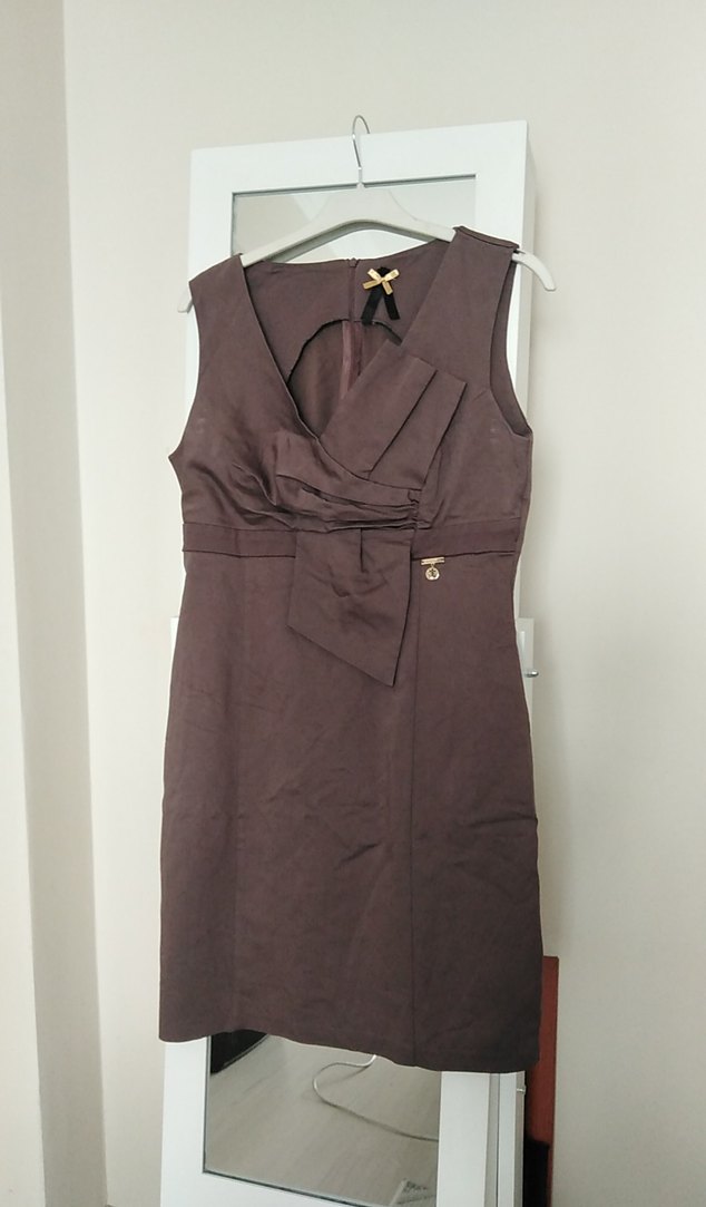 Kahverengi, kolsuz, V yaka ve kemerli midi elbise, ofis için uygun çağdaş Paris tarzında.
