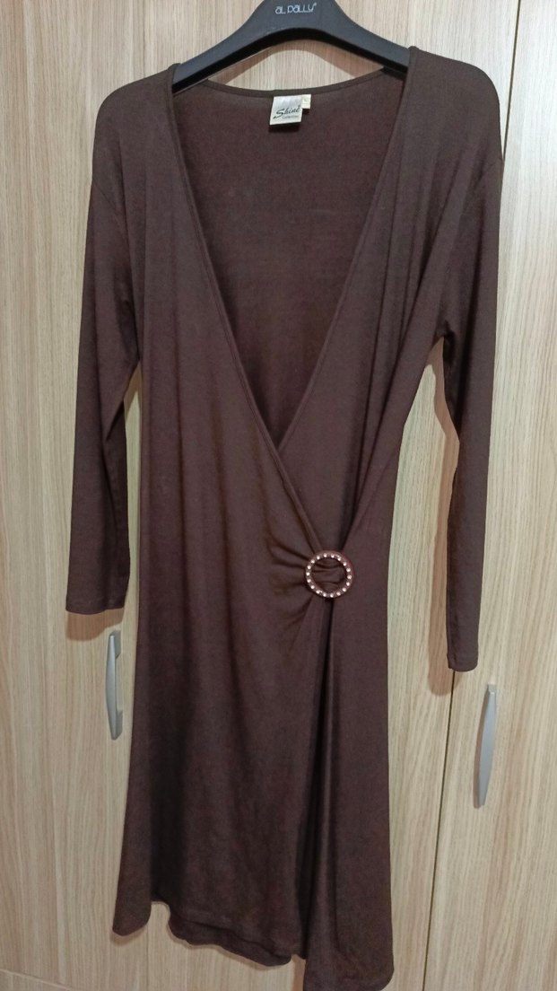 Uzun ve vücuda oturan bu elbise, V yaka ve yuvarlak tokalı kemer detayına sahiptir. Yumuşak ve parlak kumaşı günlük kullanıma uygundur. Koyu kahverengi rengiyle minimalist ve bohem tarz sunar. çok iyi durumda sadece yıkanıp ütülenmesi gerekiyor
