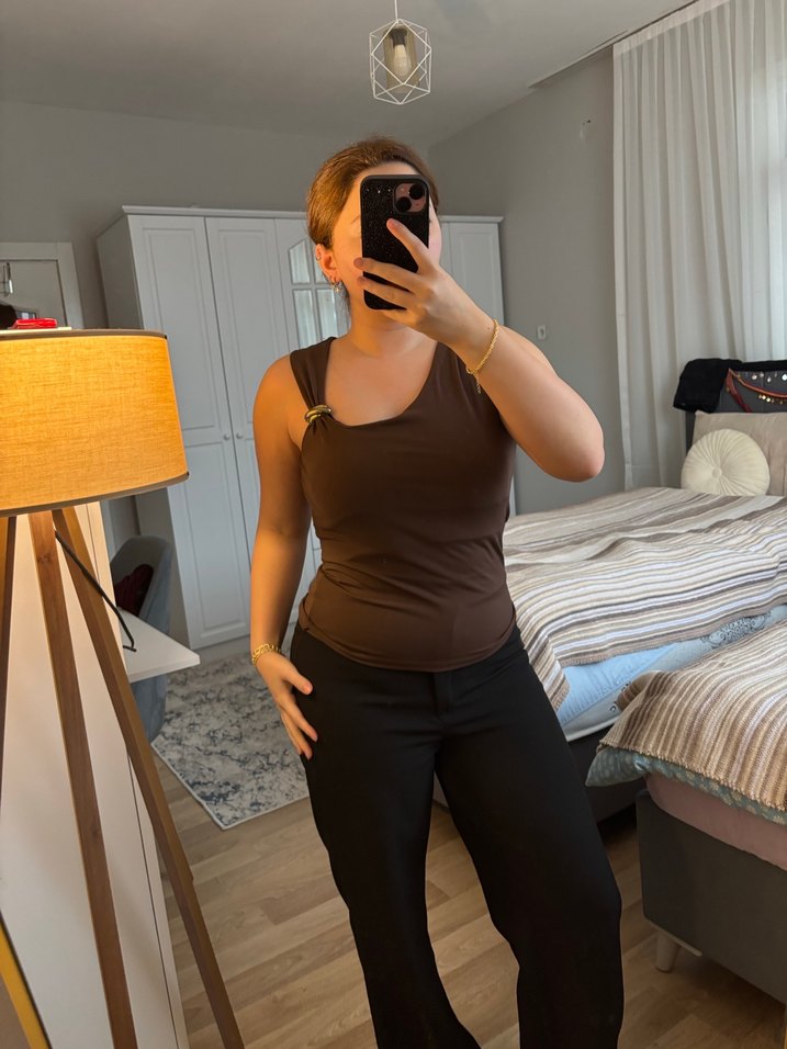 Kahverengi, V yaka, kolsuz, vücuda oturan ve midi uzunlukta olan bu body, desensiz düz renk. Altın rengi aksesuarı biraz soyuldu
