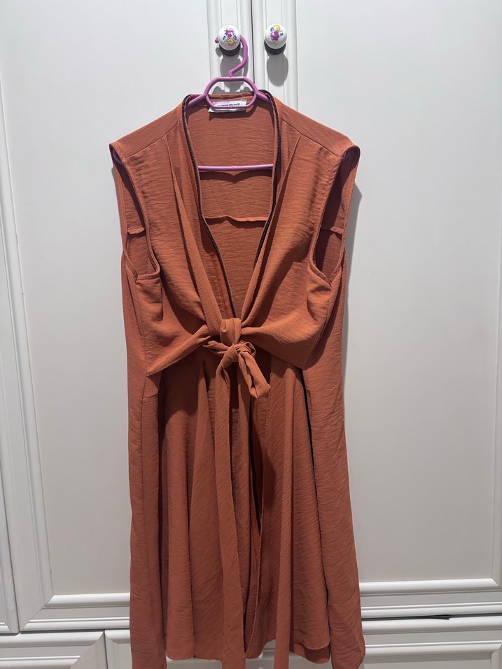 Kahverengi kolsuz yelek, V yaka ve bol kesimlidir. Keten kumaştan yapılmış, drapeli ve midi boyda, bohem tarzda günlük kullanım için uygundur.