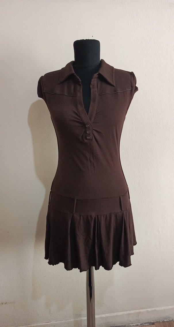 V yaka, kolsuz ve pilili etek kısmına sahip, kahverengi midi boy, vücuda oturan elbise. Yumuşak sentetik kumaştan üretilmiştir, günlük kullanım için minimalist gotik tarzda.