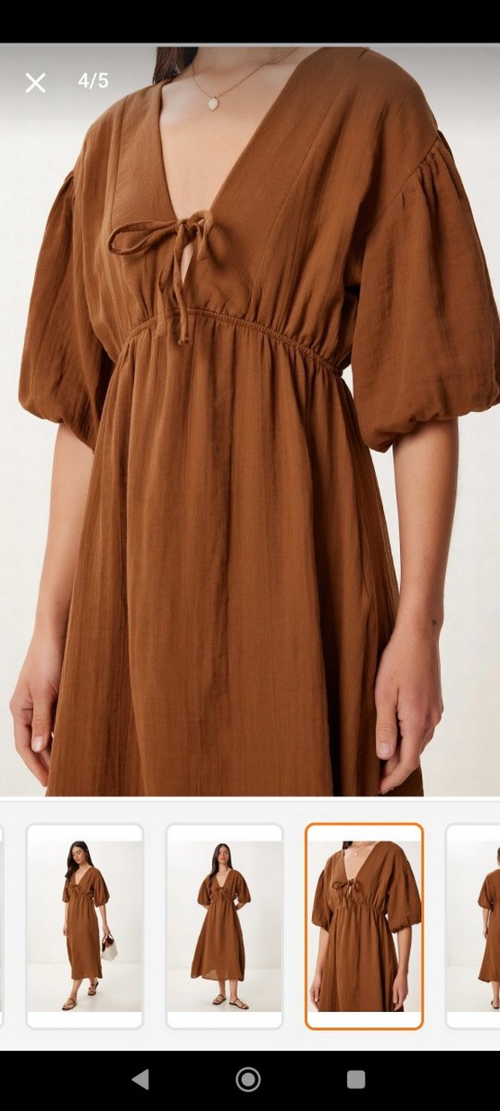 Yumuşak keten kumaştan, V yakalı, kısa ve drapeli kollu, bol kesim kahverengi midi elbise, günlük kullanım için uygundur.
