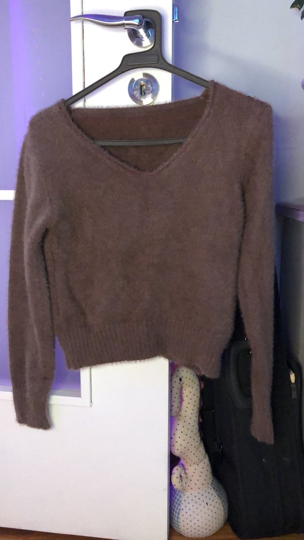 Kahverengi, V yakalı, uzun kollu, gevşek kesim örgü kadın kazak. Midi boyda ve rahat bir goth tarzı için uygundur.