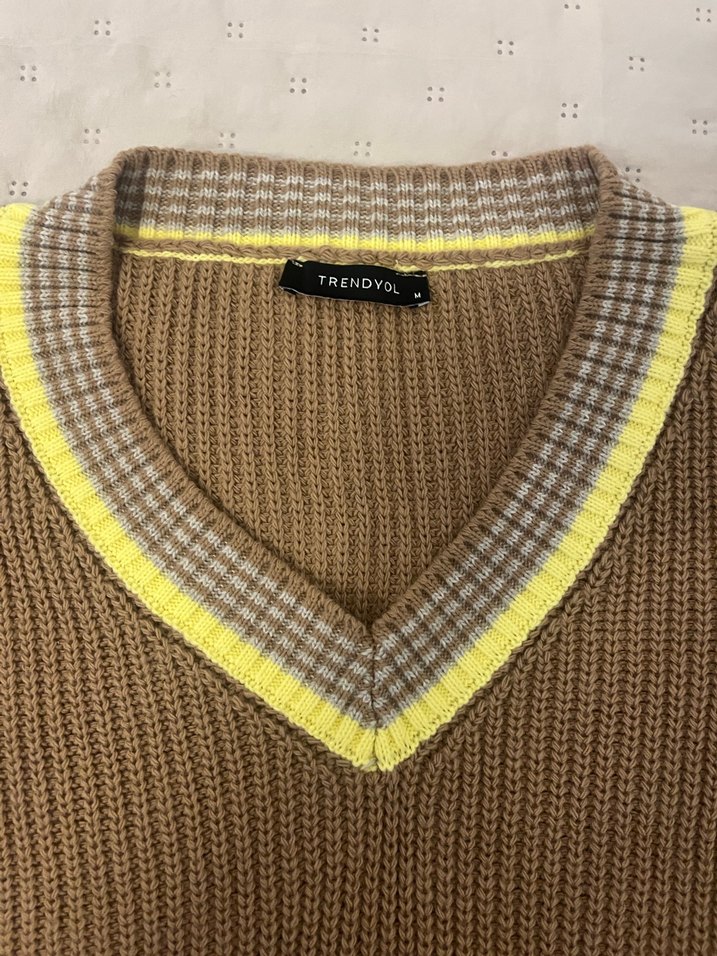 Kahverengi örgü kadın kazak, V yaka ve uzun kollu, rahat ve bol kesim. Sarı ve gri detaylar bulunur.