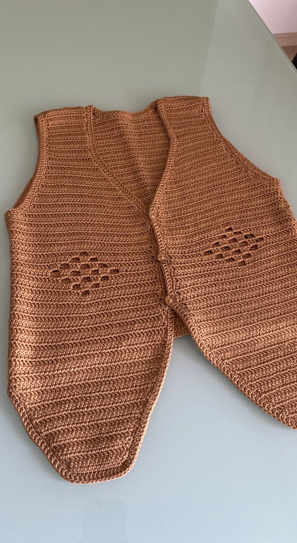 Kahverengi, V yaka ve kolsuz örgü yelek. Rahat ve bol kesimiyle gündelik kullanıma uygun, parlak dokulu bohem tarzda bir parçadır.