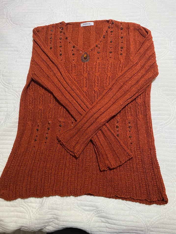 V yaka ve uzun kollu, kahverengi örgü kumaştan yapılmış, bohem tarzda, fitted kesim kadın kazak. Rahat ve retro görünüm sağlar.