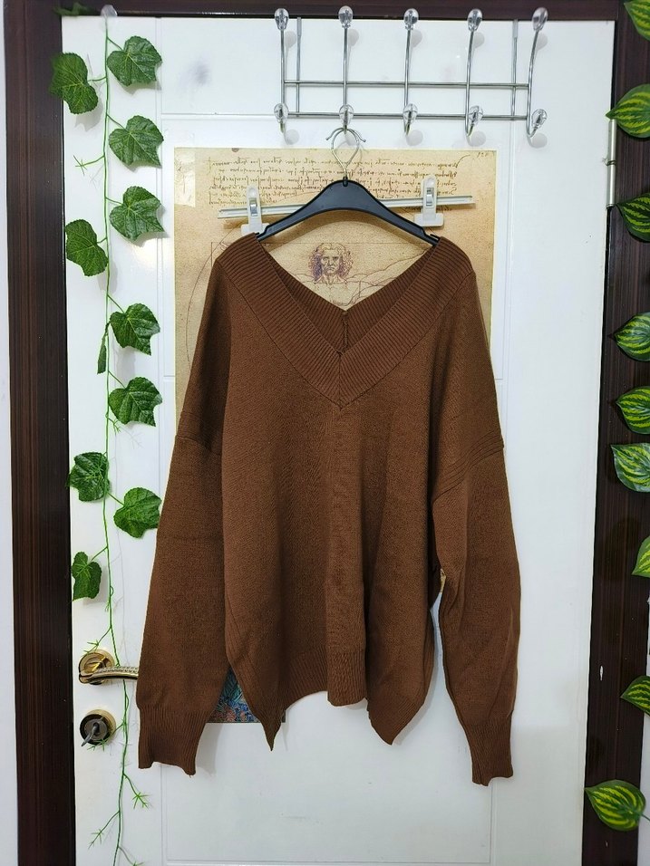 Kahverengi örgü kazak, V yaka ve uzun kollu, bol ve midi boyda. Desensiz, rahat tasarımı bohem tarzına uygundur. Oversize olduğu için beden konusunda emin değilim ilgilenirseniz başka ölçülerini de atabilirim