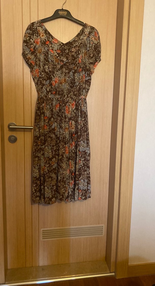 Kahverengi ipekli, uzun elbise, pileli detaylar ve V yakaya sahiptir. Kısa kollu ve koyu tonlarda batik desenlidir, günlük kullanıma ve özel günlere uygundur.