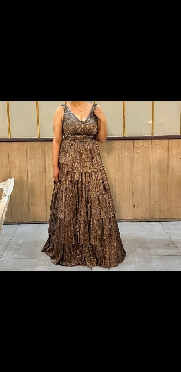 Kahverengi, parlak, V yakalı ve kolsuz uzun elbise. Pileli kumaş ve bol kesimiyle bohem ve gösterişli bir tarz sunar, düğünlere uygundur. ✨ Tam kalıp. hiçbir defosu yoktur. sadece 1 defa giyildi.