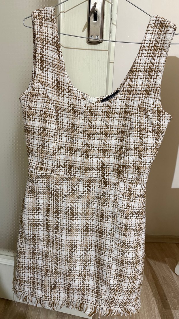 Kahverengi ve beyaz triko kumaştan, V yakalı, kolsuz midi elbisedir. Paris sokak modasına uygun, şık ve rahat bir modeldir. iade yoktur herhangi bir deformasyon de yoktur
