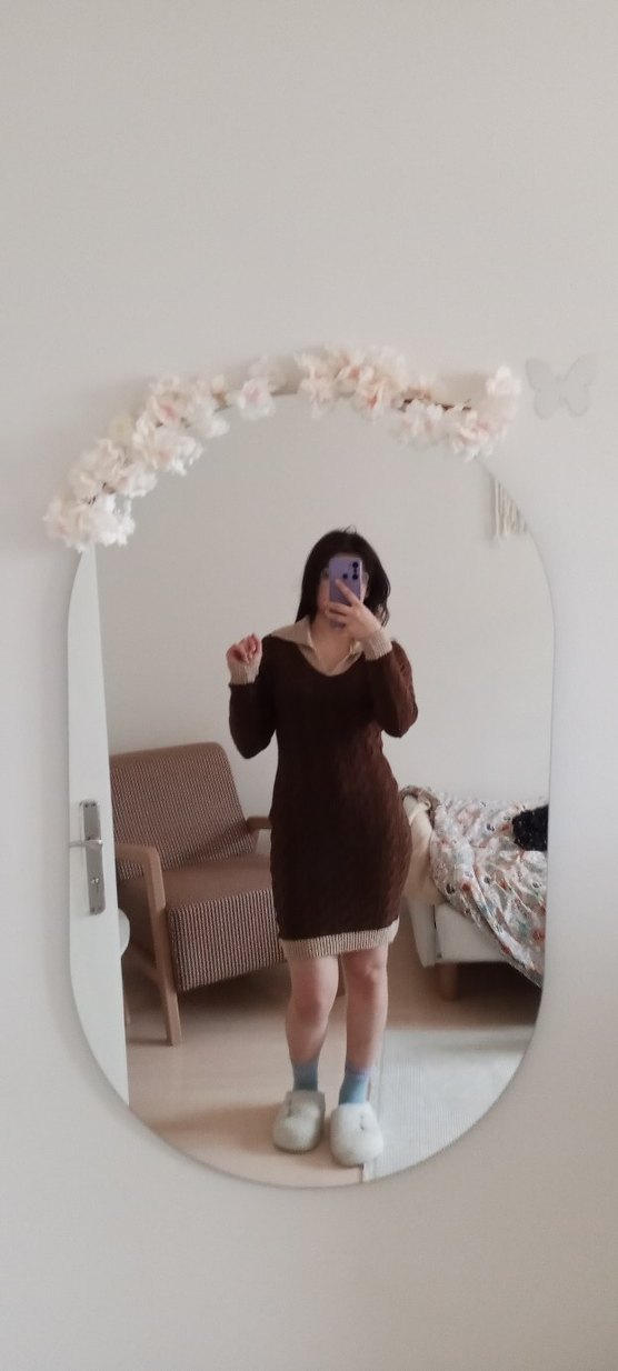 Kahverengi triko midi elbise, V yaka ve uzun kollu, vücuda oturan kesimiyle rahat ve şık bir günlük kullanım sunar. bedeni standarttır ve riklalı sıcak tutuyor boyum 1.70 olduğu için ekstra kısa duruyor ama normal