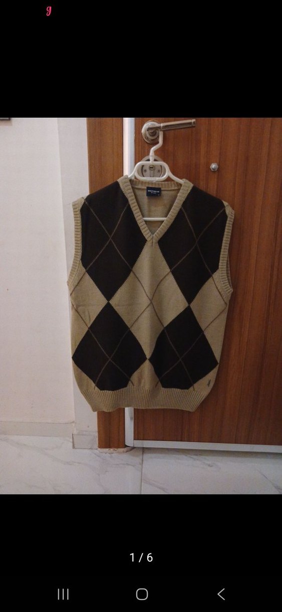 V yaka, kolsuz kahverengi triko süveter. Rahat kesimli ve klasik argyle desenli, günlük sokak stili için uygun.