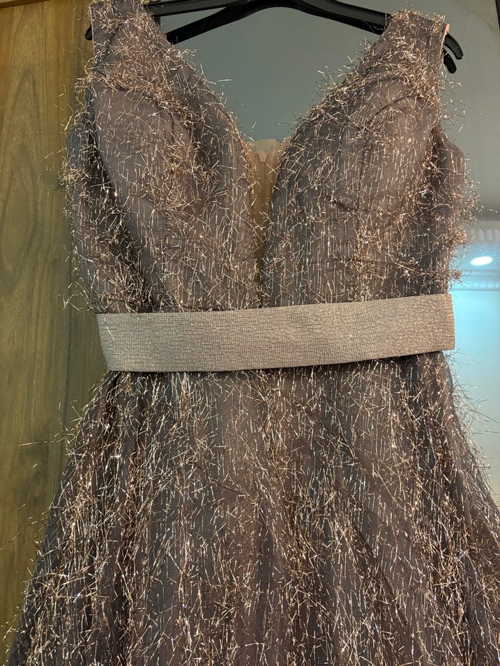 Kahverengi, uzun ve v yaka olan bu abiye elbise, kemerli ve askılı kollu, avangard bohem tarzında tasarlanmıştır. ✨