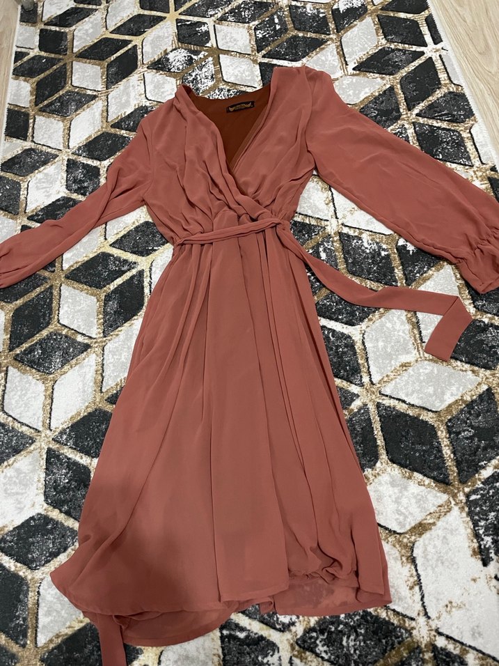 Kahverengi, V yakalı ve uzun kollu, drapeli tasarımlı, bol kesim sentetik kumaş uzun elbise. Günlük kullanıma uygun klasik şıklıkta.