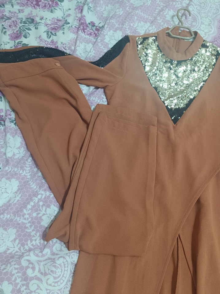 Kahverengi uzun, V yakalı, drapeli ve bol kesim ikili takım parlak sentetik kumaştan, parti için uygun. ✨lekeler var kullanıma engel değil yıkanınca geçebilir ama yinede uygun fiyat