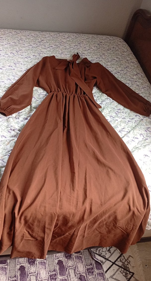 Kahverengi uzun keten elbise, bol kesim ve drapeli detaylara sahiptir. Uzun kollu ve yakalı, vintage bohem tarzındadır.