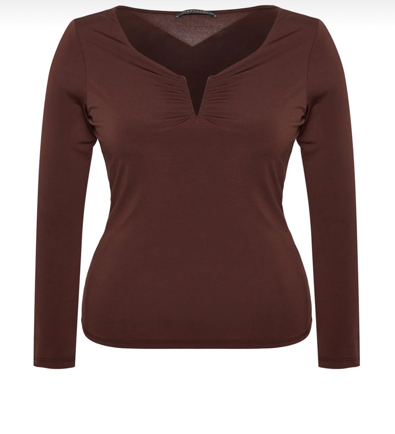 V yaka ve uzun kollu, kahverengi tonunda, sentetik kumaştan yapılmış, ofis için uygun, minimalist ve çağdaş tarzda dar kesim kadın bluz. ✨ Vücuda oturuyor göğüsünüz çok büyük olmasa bile sarıyor etiketli