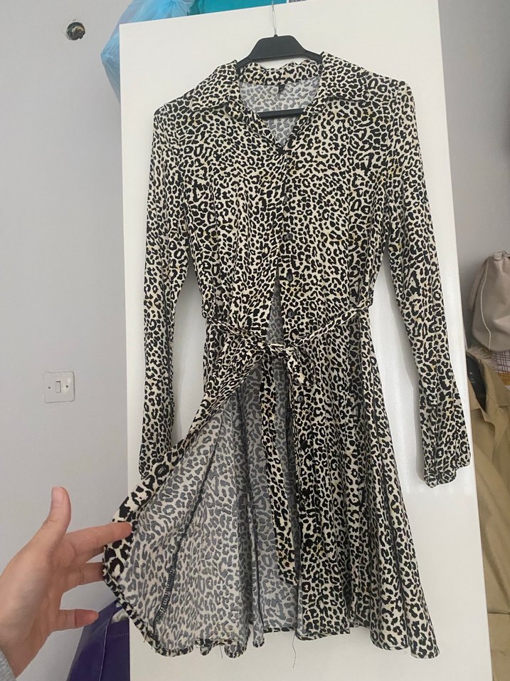 Kahverengi yılan desenli, V yakalı, uzun kollu, kemerli ve vücuda oturan midi elbise, yumuşak sentetik kumaştan üretilmiştir.