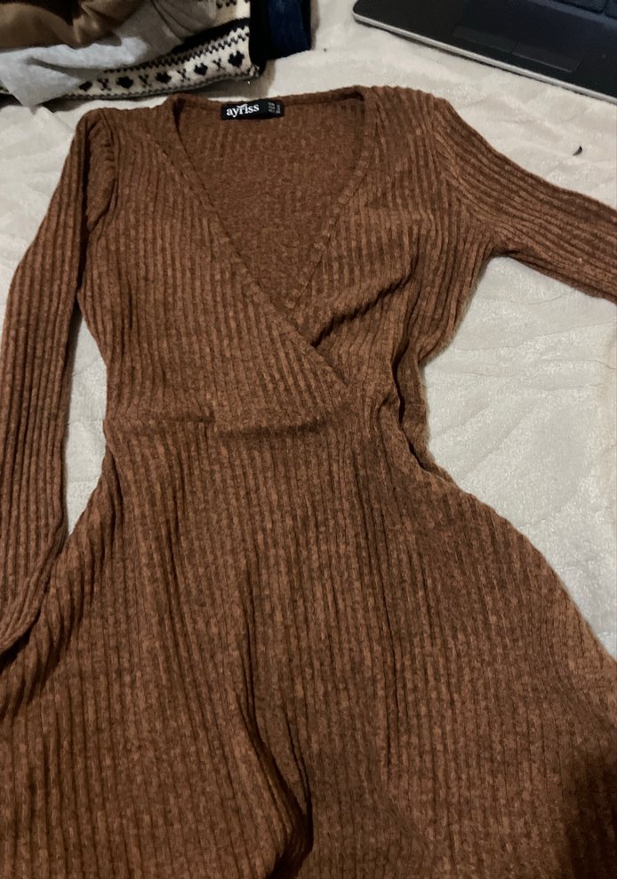 Kahverengi V Yaka Uzun Kollu Triko elbise