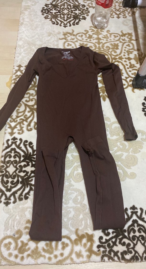 Koyu kahverengi, V yaka ve uzun kollu, sentetik kumaştan yapılmış, şık ve rahat tulum. Günlük kullanım için uygundur. Vücudu sarar spor içinde kullanılabilir S m bedendir