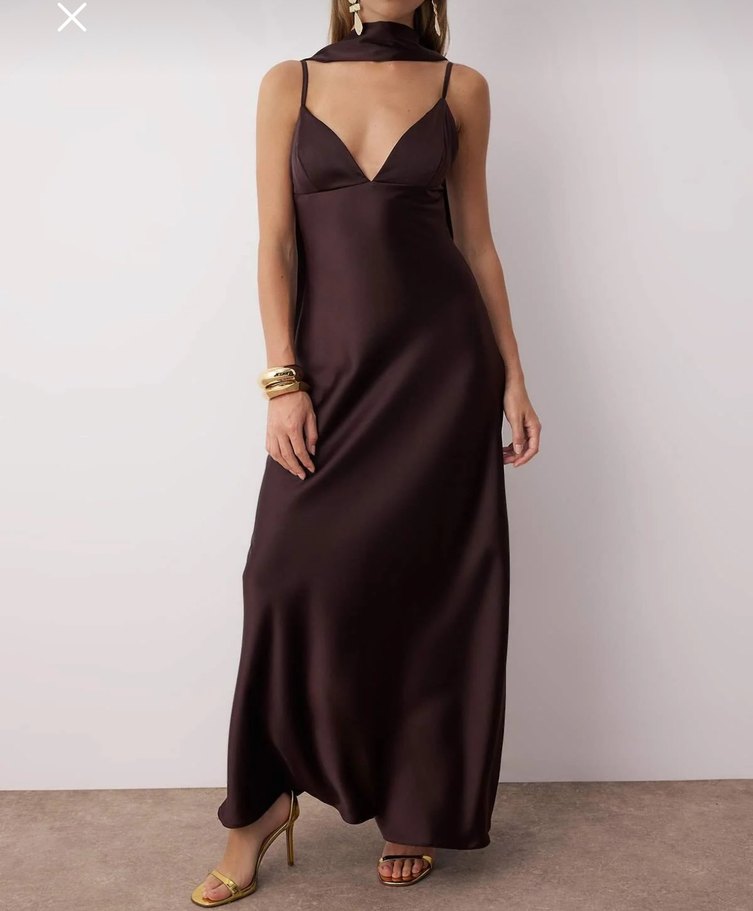 Kahverengi uzun elbise, V yaka ve ince askılı, saten dokuda, drapeli tasarıma sahiptir. Romantik akşamlar için ideal, rahat kesim.