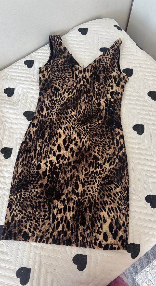 V yaka, kolsuz, kahverengi yılan desenli midi elbise, kürk detaylarıyla zenginleştirilmiş, şık ve bohem tarzda parti elbisesi.