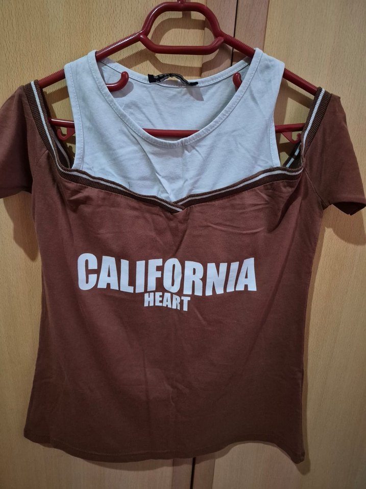 Kahverengi, pamuk kumaştan, V yakalı ve kemerli kısa kollu kadın tişörtü. Ön kısmında "CALIFORNIA HEART" baskısı bulunur. Günlük sokak stili için uygun.