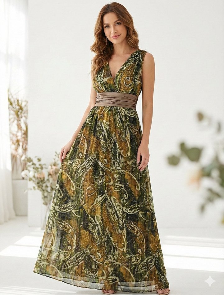 Kahverengi V Yakalı Kemerli Uzun Bohem Elbise