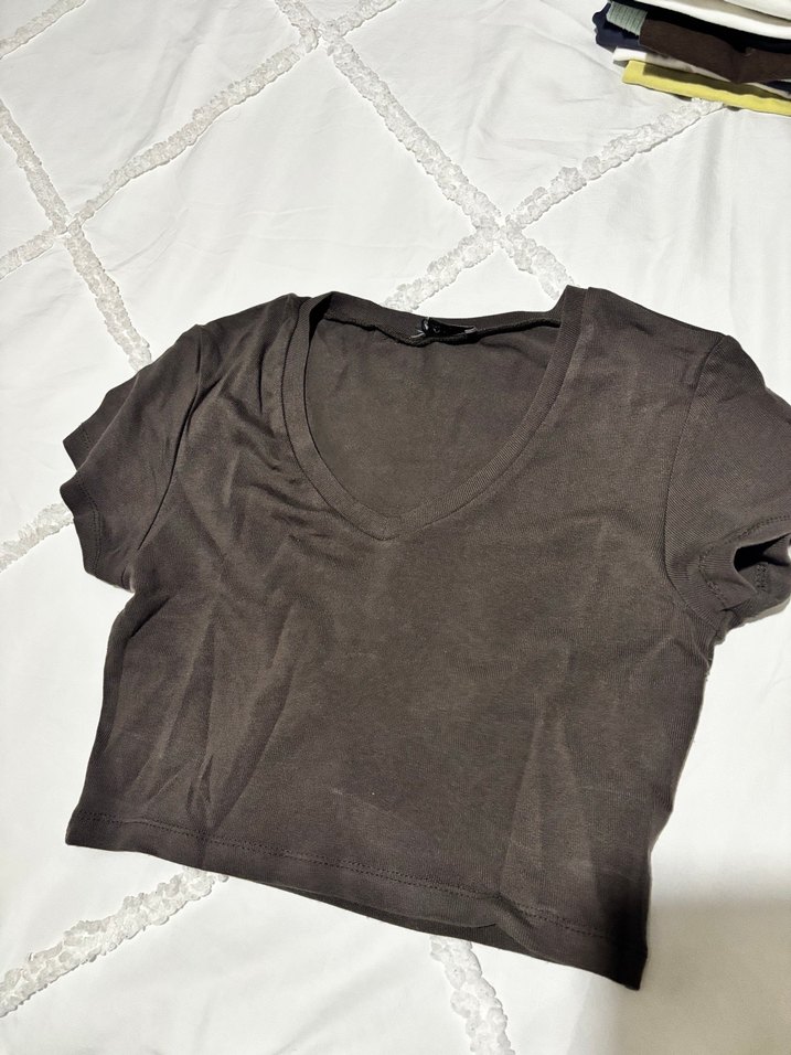 Kahverengi V Yakalı Kısa Kollu Crop Top