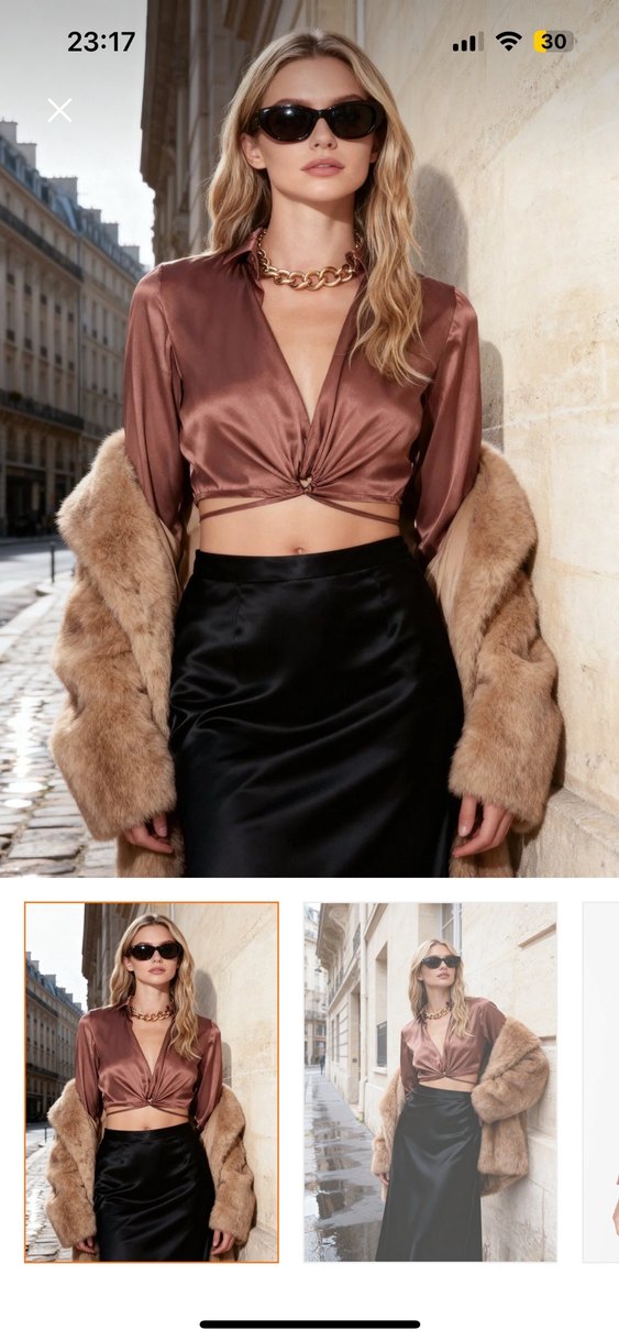 Kahverengi, saten ve v yakalı bu kısa bluz, uzun kollu ve vücuda oturan kesime sahiptir. Kürk detaylı dış giyimle kombinlenebilir. ✨