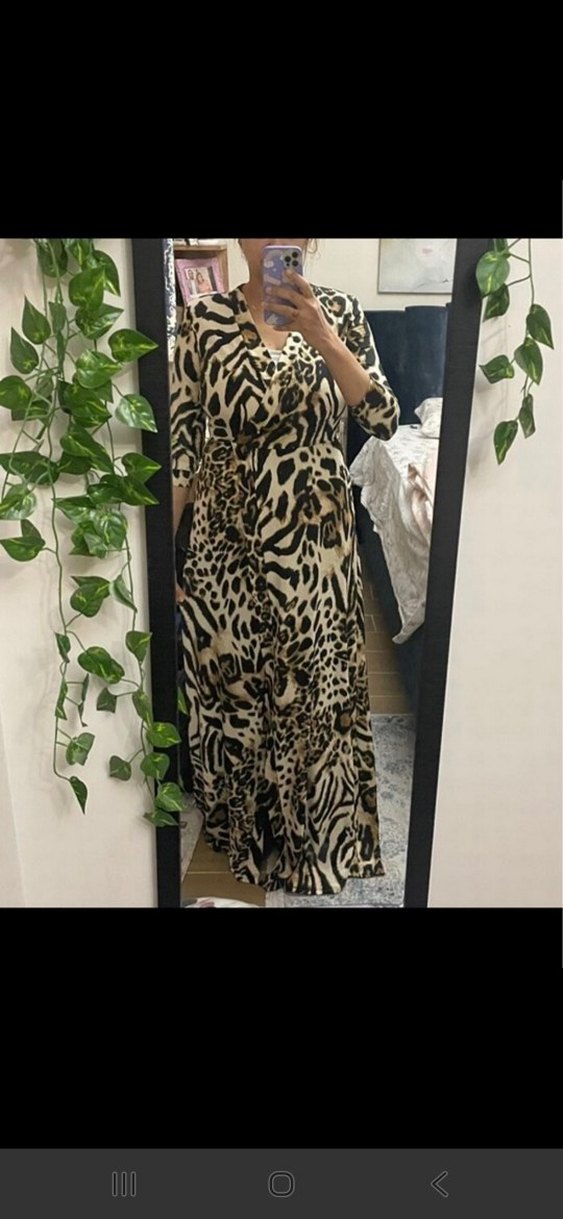 leopar uzun elbise, Uzun kollu, V yakalı ve bol kesimdir, yumuşak kumaştan yapılmıştır. 1.80 boy tam bilekte