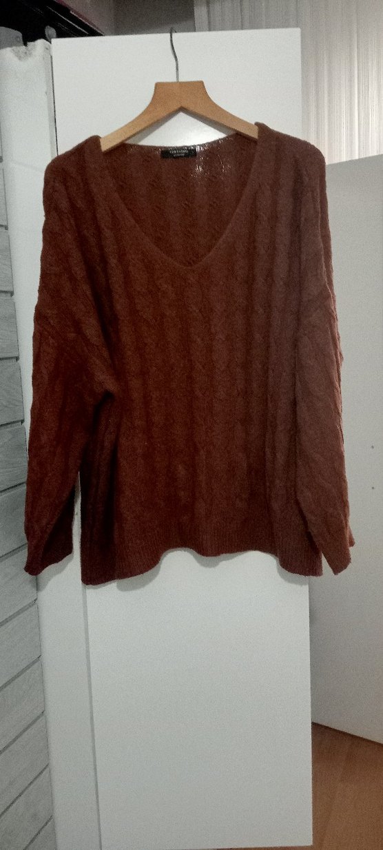 Kahverengi, V yakalı, uzun kollu örgü kadın kazak. Bol kesimi ve bohem tarzıyla günlük kullanıma uygundur.
