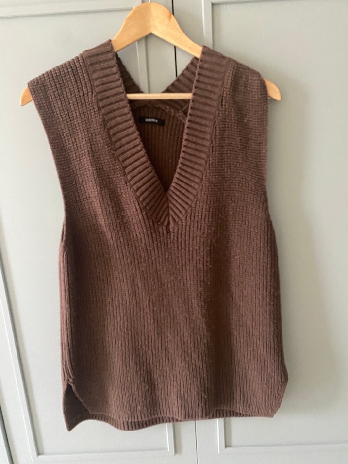 Kahverengi, V yakalı, örgü kadın süveteri. Rahat kesim, kolsuz ve midi boyda, yumuşak örme kumaştan. Günlük sokak stili için uygun, desen içermeyen rahat tasarım.
