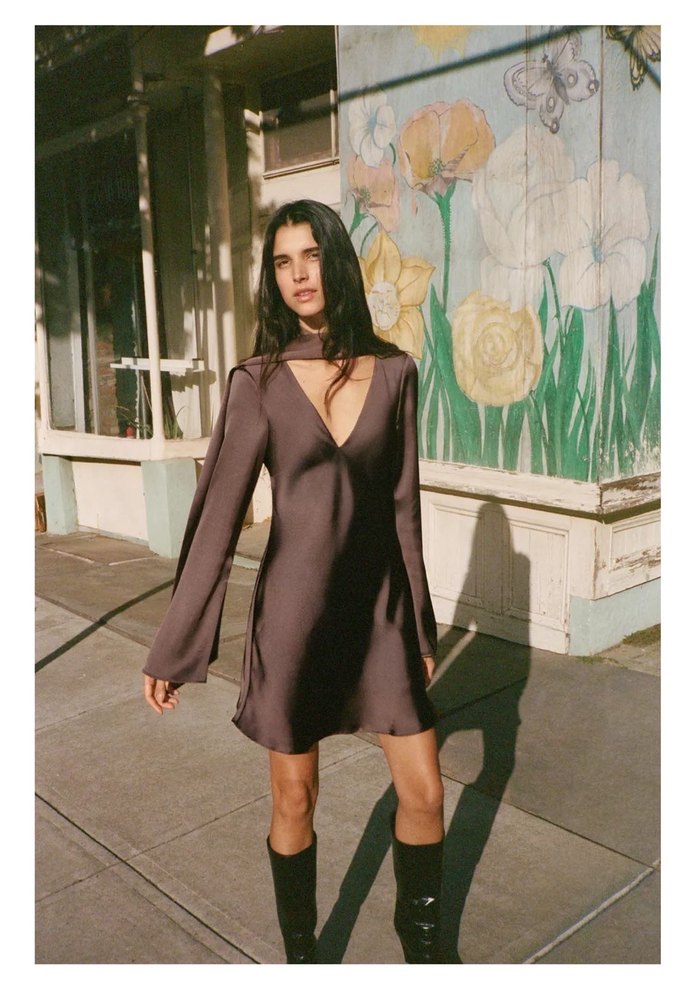 Kahverengi, saten kumaştan, uzun drapeli kollu ve V yakalı, vücuda oturan mini elbise. Cesur romantik buluşmalar için ideal.