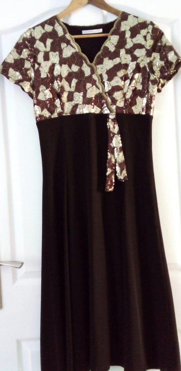 Kahverengi bağlama desenli, drapeli V yakalı, uzun ve kolsuz bohem tarzda, vintage esintili dar kesim bir gece elbisesi.