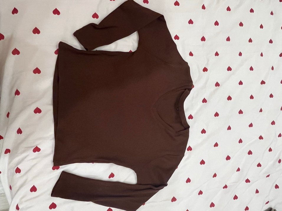 Kahverengi, pamuk kumaştan, V yakalı ve uzun kollu, fit kesim Minimalist tasarımıyla günlük kullanıma uygundur.