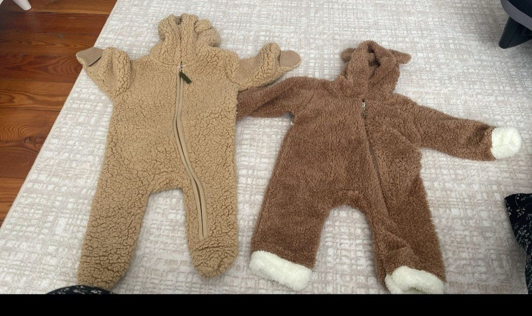Kahverengi ve bej renklerde, kürk detaylı, yumuşak ve sıcak erkek bebek tulumları, sade ve rahat bir stile sahip.