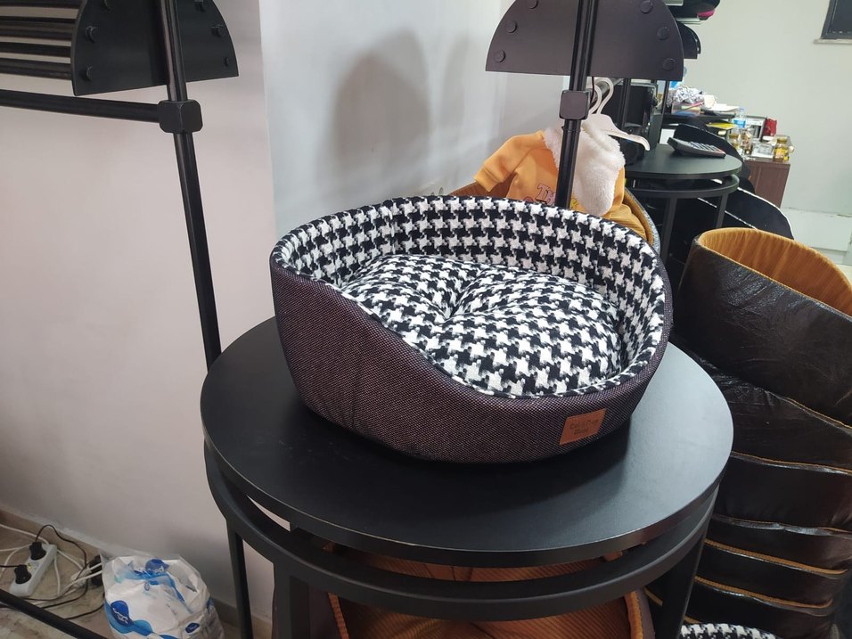 Kahverengi dış kumaş ve desenli yumuşak yastıklı, konforlu kedi yatağı .