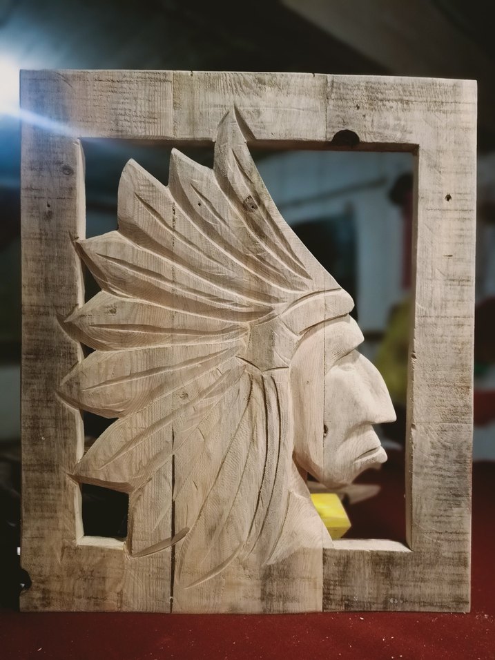 Doğal kahverengi ve gri tonlarda, tüy başlıklı Kızılderili şefi profilini gösteren detaylı ahşap figür. Rustik çerçeveli tasarım. ,62*52 cm ölçülerinde.