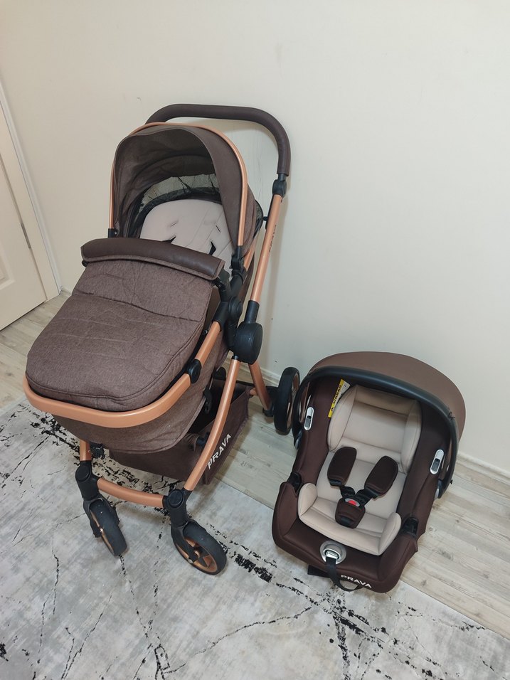 Kahverengi ve gri renklerde, sağlam iskeletli ve konforlu pedli bebek arabası ve uyumlu oto koltuğu seti. hiç kullanılmadı denilecek kadar az kullanıldı.