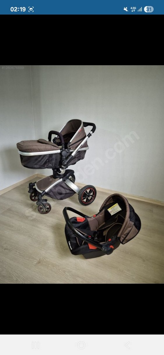Kahverengi ve gri renkli bebek arabası seti, sağlam çerçeve ve uyumlu bebek koltuğu içerir. Pürüzsüz tekerlekleri ve rahat oturma alanı vardır.