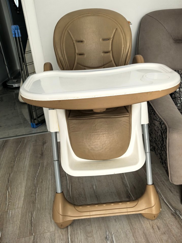 BALIKESİR merkez elden teslim Kahverengi oturağı ve gri tabanı olan, çıkarılabilir beyaz tepsili bebek mama sandalyesi. Rahat ve kullanışlıdır.