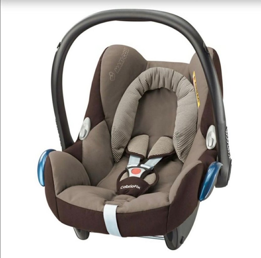Kahverengi ve gri yumuşak kumaşlı, güvenli emniyet kemeri sistemine sahip bebek oto koltuğu. Konforlu destek yastığı içerir. Model adı "cobrioF" görünür.