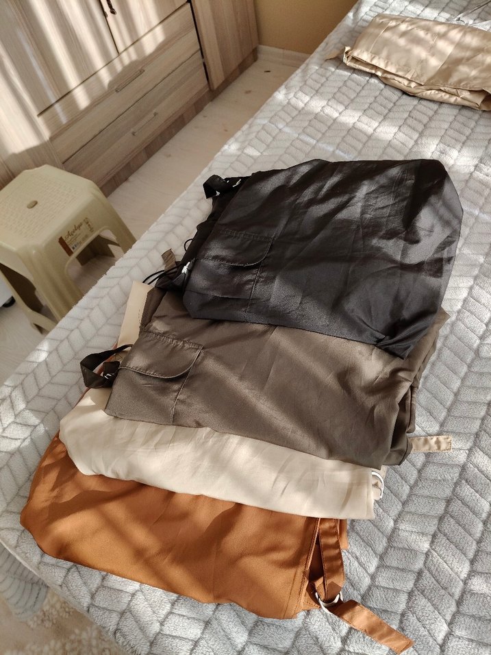 Kahverengi ve gri tonlarda, yumuşak dokulu bebek slingleri. Ayarlanabilir kayışlarla rahat ve güvenli taşıma sağlar.
